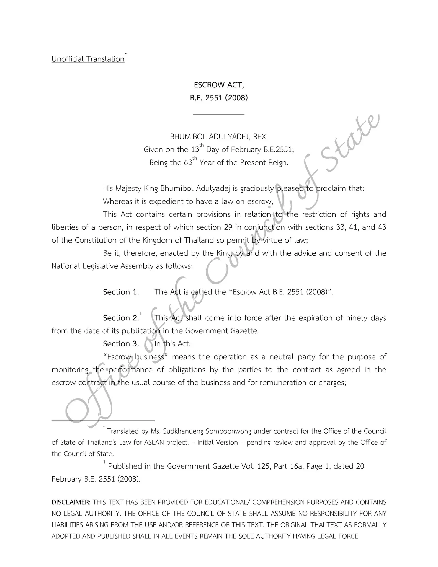 Escrow Act B.E. 2551 (2008)